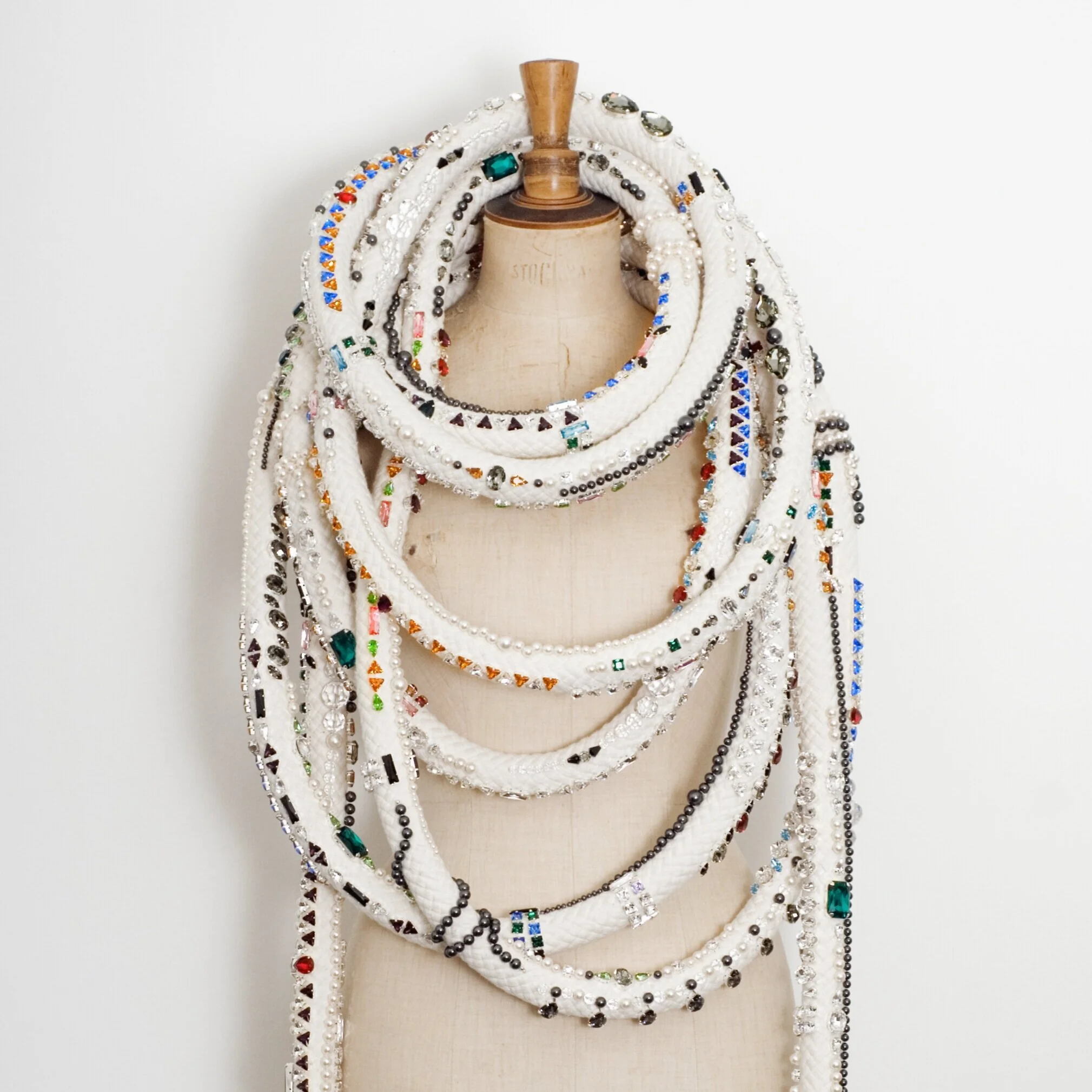 These pieces, well-known or little-known, unique, familiar, handmade, mass-produced, or computer made, mix refined, hand-wrought, amateur and even futuristic aesthetics which are rarely associated together. They sometimes go far beyond simple jewellery and explore other means of engaging with, and putting on, jewellery.